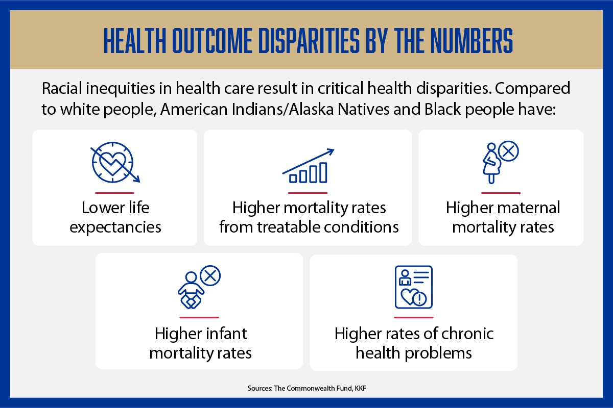 Racial inequities in health care result in critical health disparities. According to The Commonwealth Fund and KKF, compared to white people, American Indians/Alaska Natives and Black people have: lower life expectancies, higher mortality rates from treatable conditions, higher maternal mortality rates, higher infant mortality rates, and higher rates of chronic health problems.