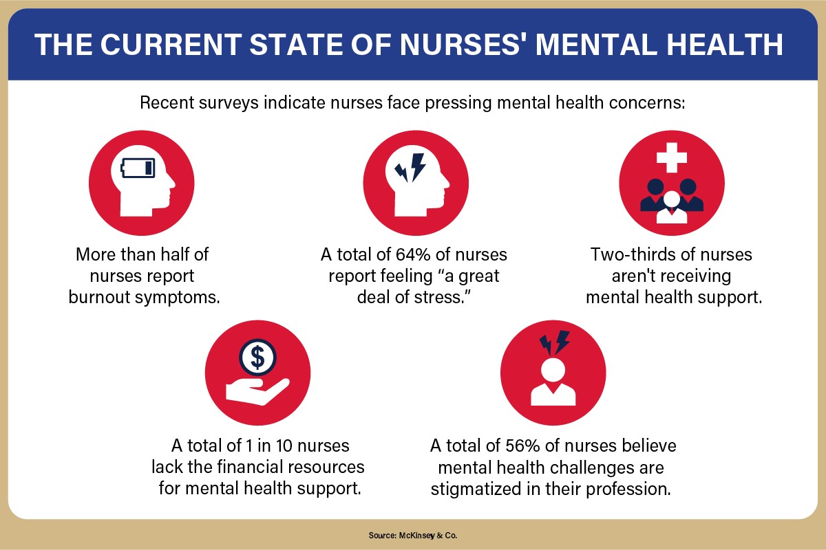 Recent surveys by McKinsey & Co. indicate that nurses face pressing mental health concerns: More than half of nurses report burnout symptoms, 64% of nurses reported feeling “a great deal of stress,” two-thirds of nurses weren’t receiving mental health support, 1 in 10 nurses lacked the financial resources for mental health support, and 56% of nurses believed that mental health challenges were stigmatized in their profession.