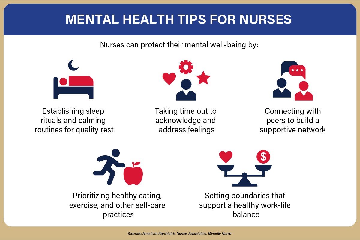According to the American Psychiatric Nurses Association and Minority Nurse, nurses can protect their mental well-being by establishing sleep rituals and calming routines for quality rest; taking time out to acknowledge and address feelings; connecting with peers to build a supportive network; prioritizing healthy eating, exercise, and other self-care practices; and setting boundaries that support a healthy work-life balance.